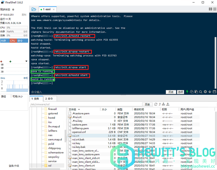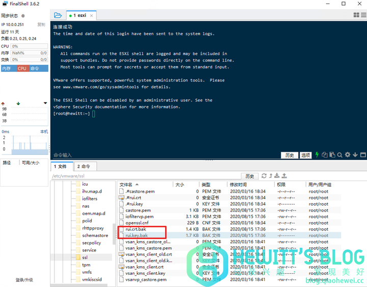 3、连接成功后进入 /etc/vmware/ssl 目录,rui.crt、rui.key,是默认的证书文件。