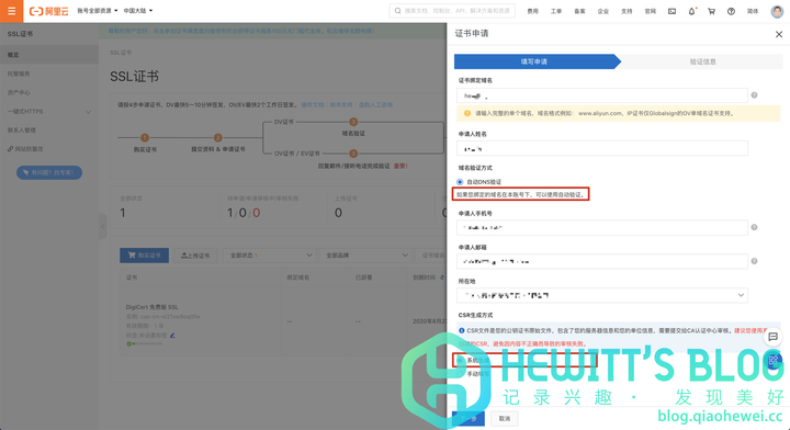 3、填写要申请SSL证书的域名,如实填写申请人姓名等信息,CSR生成方式选择系统生成即可,因为演示域名由阿里云注册,且在购买SSL证书的账号下,所以可以使用“自动DNS验证”。