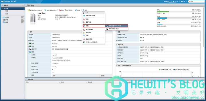 1、登入ESXI后台,点击“操作” — “服务”– “启用安全Shell(SSH)”,只有开启SSH后才可以替换证书。